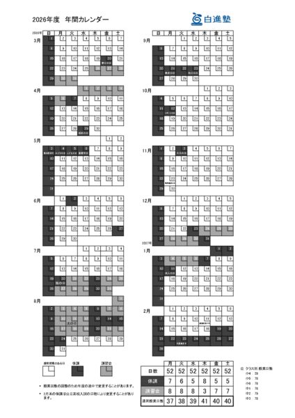白は塾がある日、黒は休みの日、グレーは講習会です。曜日ごとの授業回数をなるべくそろえるため、祝日でも授業を行う日がありますよ。