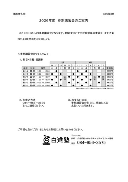 良いスタートを切るためには前の学年の内容を確かなものにしておかなければ。とりあえず春期講習会だけ受講してみようと思っている方はこちらのカリキュラムをご覧ください。